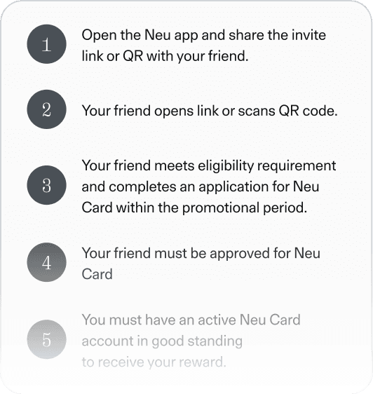 That's right, get $20 for every friend you refer who is approved for Neu Card, up to 25 friends.